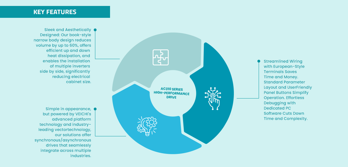 AC310 Series VFD is a cutting-edge vector inverter, building upon VEICHI's AC300 hardware design philosophy. While it preserves the hallmark features of VEICHI's new-generation products, it introduces groundbreaking advancements in functional performance. This inverter not only incorporates state-of-the-art field-oriented vector control technology but also expands control capabilitiesto various load types, including voltage-frequency separation EPS power supply, thus enhancing compatibility with both asynchronous and synchronous motor control.